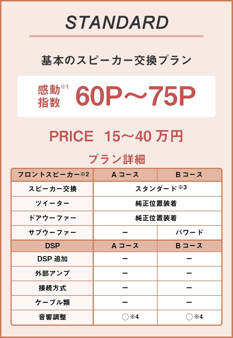 スタンダードエリアでのスピーカー交換にプラスして、スピーカーから出てくる音を積極的に整え、音響のクオリティを爆上げするプラン。