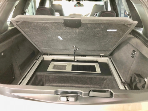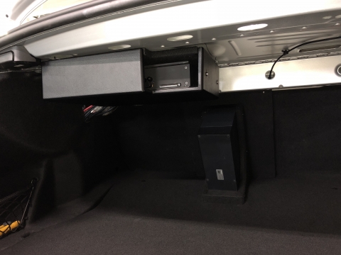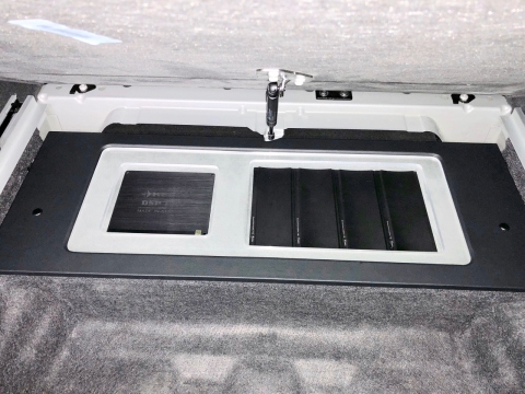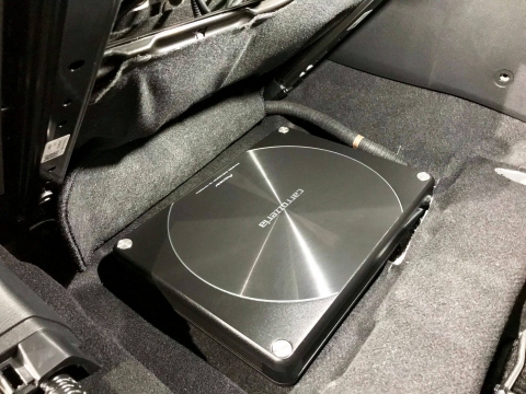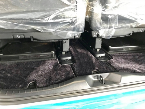 超薄型のサブウーファーをサードシート下に固定しましたので、トランクスペースを犠牲にすることなく、心地のいい重低音を手に入れることができました。