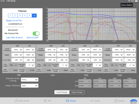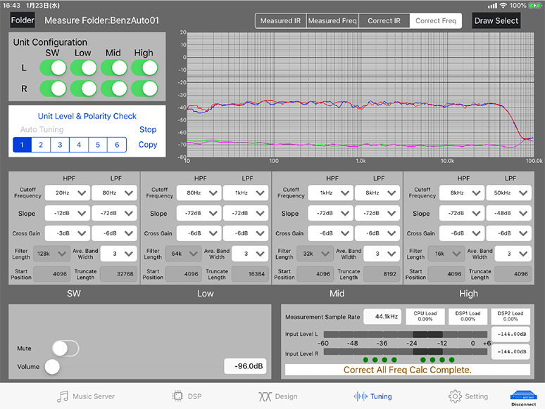 オートチューニング画面車室内実測測定例(1/6 oct. で測定)