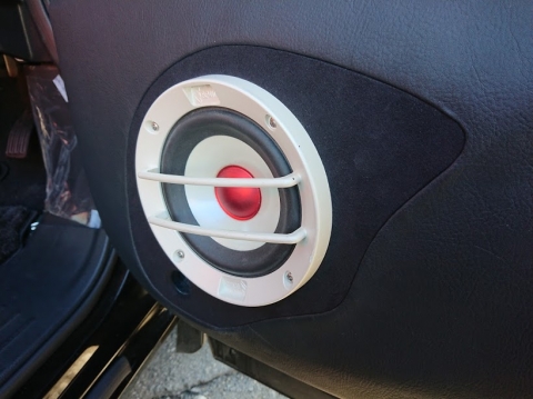 フロント2wayシステムのみで完結して低音まで再生できるように、ドアに専用のエンクロージャーを組み込むワンオフ製作を行いました。アウターグリル下部に空いている穴はバスレフボックスのポートです。サブウーファーがなくても、超重低音までしっかり再生できるようになっています。