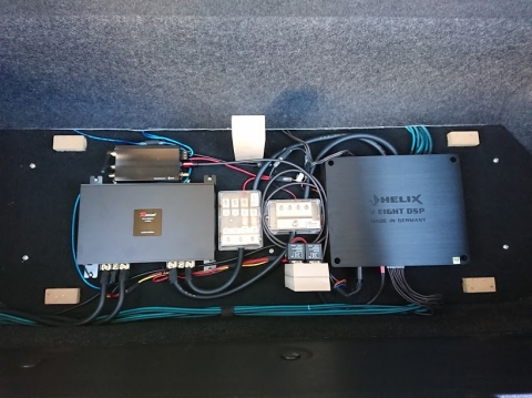 これらをコントロールするのはアンプ内蔵プロセッサーのHELIX V-EIGHT。ラゲッジフロア下にアンプボードを製作して、その上に荷物を置けるようにラゲッジボードを設置しました。
