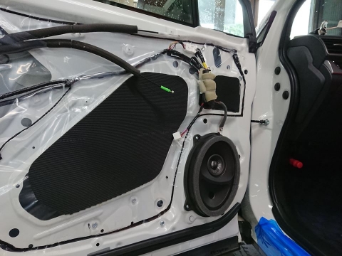 前後スピーカーを高性能エンクロージャー型スピーカーに交換することによりデッドニングなしで圧倒的にクリアな音が手に入り更に音漏れを激減することできました。