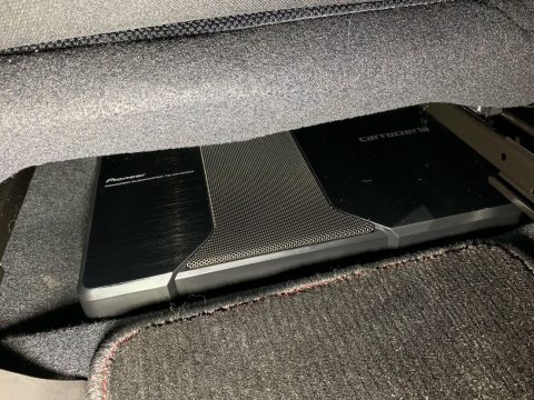 サブウーファーは運転席下に固定しました。スバル専用サウンドナビ用の外部入出力ケーブルをご用意していただき、RCAケーブルにてサブウーファーを接続することにより、ナビ側でしっかりコントロールできるようにしました。